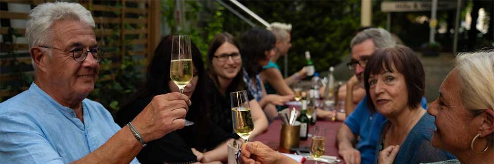 Genießt laue Sommerabende in unserem idyllischen Außenbereich! Ob mit Freunden, Familie oder Kollegen – wir servieren sommerliche Snacks und erfrischende Getränke oder stellen ein individuelles Menü zusammen.